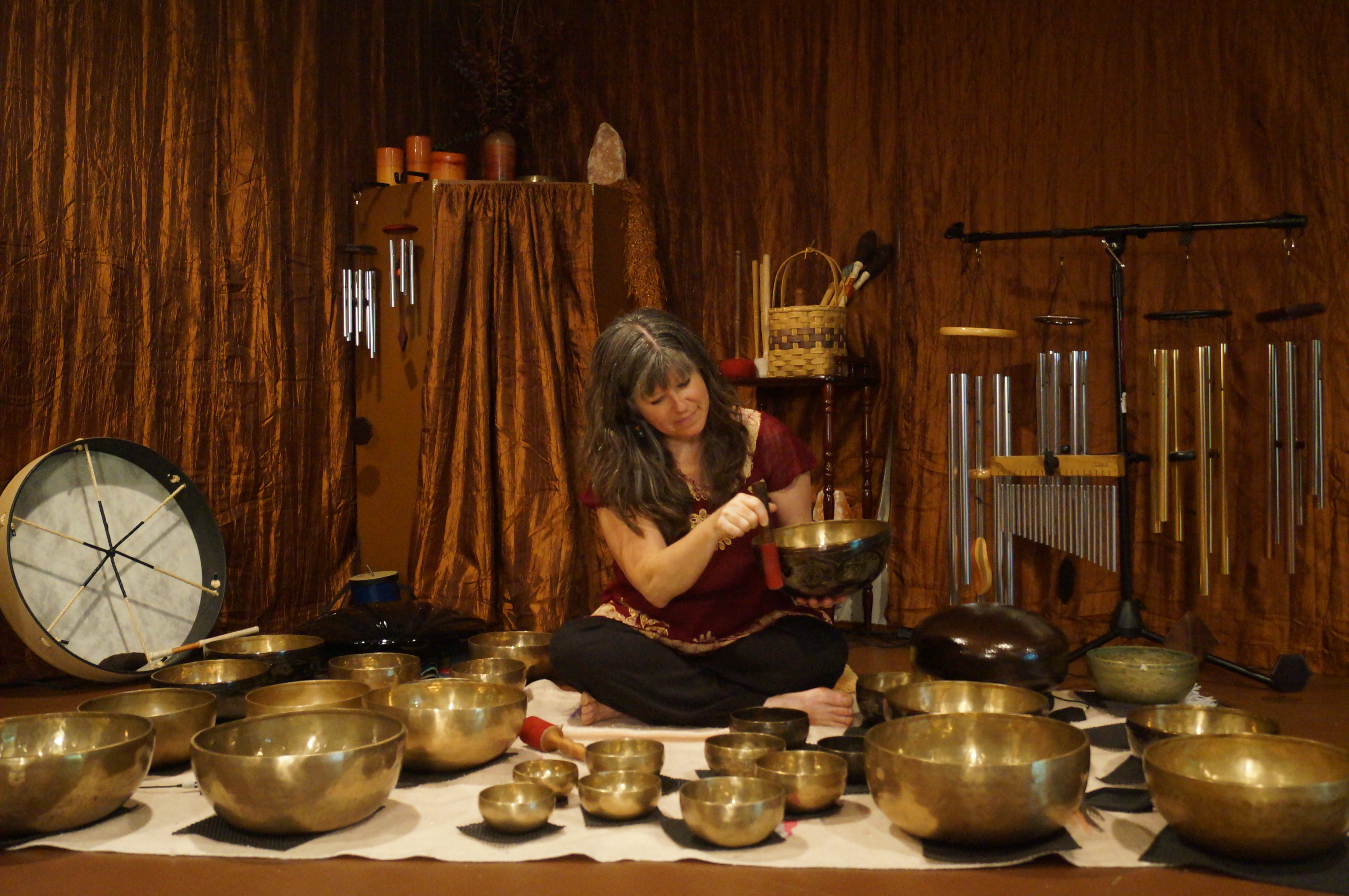 Himalayan Singing Bowls are objects said to be used by Tibetan Buddhist monks for meditation and rituals. They are made of precious metals and hammered by hand to reveal their unique musical and vibrational properties. The tones, overtones and sound-waves of the bowls draw all of our attention to them and bring us into a state of ease – positively affecting the mind, central nervous system, physical body and chakras or energy centers of the body. During a musical journeying experience, the Himalayan bowls and other instruments interweave to lead and accompany your inner travels. Variously tuned Chimes dapple sound throughout and allow for their own images and feelings to occur. A beating heart may show itself in a Native American Drum. Rainstick and Rhythm Instruments bring the ambience of nature. Mystical Musical Drums interact with the bowls and take their own time to transport the mind and lead the way to heart center. A large Chau Gong brings an immediate sense of inward connection to present time. The melodies that are drawn out of the instrument called Voice bring you home to your essence.